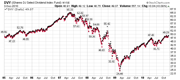 Brinker first added DVY to the Marketimer Individual Issues list in January, 2005 when the price was $60.70 (it is still on the list). Like Brinker did when he added GLD in May, 2009, he gave no advice about it or any price range. Theoretically, there are no limits on DVY or GLD since Brinker regularly says this: "Marketimer recommends managing specific stock risk by holding individual stock positions to a weighting of four percent or less of equities. This does not apply to the exchange-traded funds listed in the table. MSFT and VOD are rated "hold"."